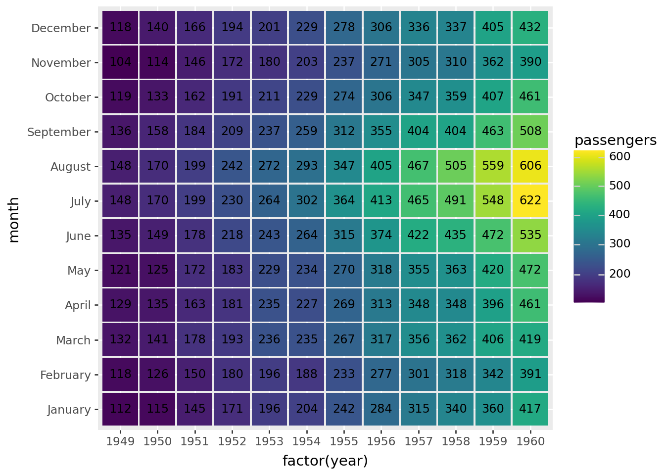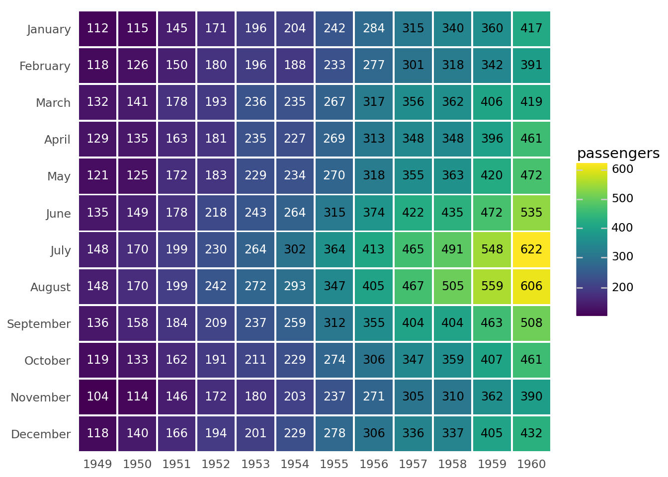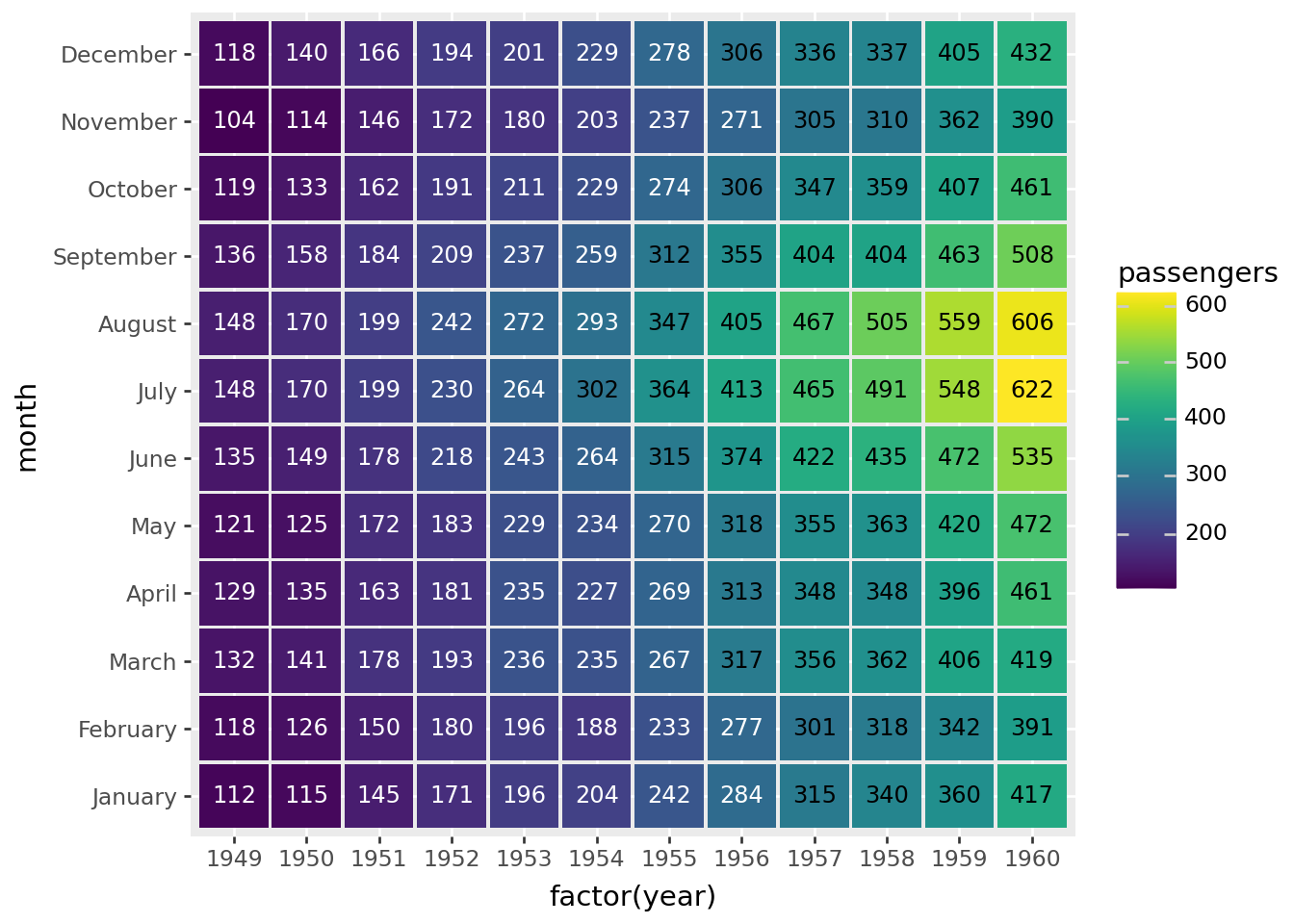 + geom_text(aes(label="passengers", color="p_group"), size=9, show_legend=False) # modified