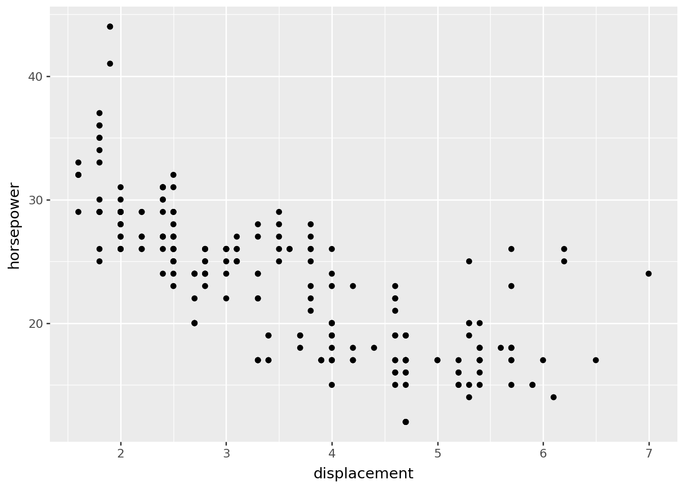 ggplot(mpg, aes(x="displ", y="hwy"))
