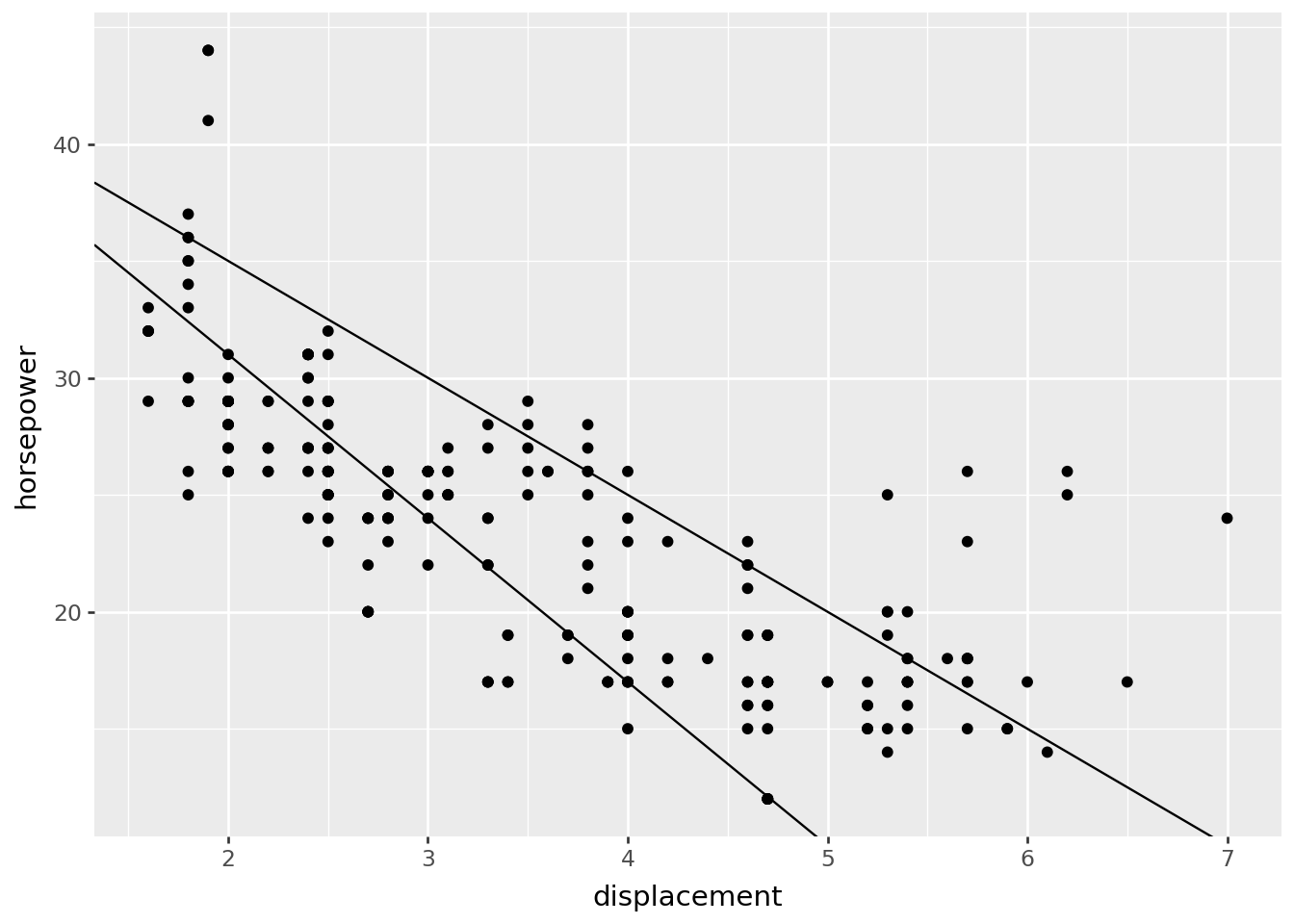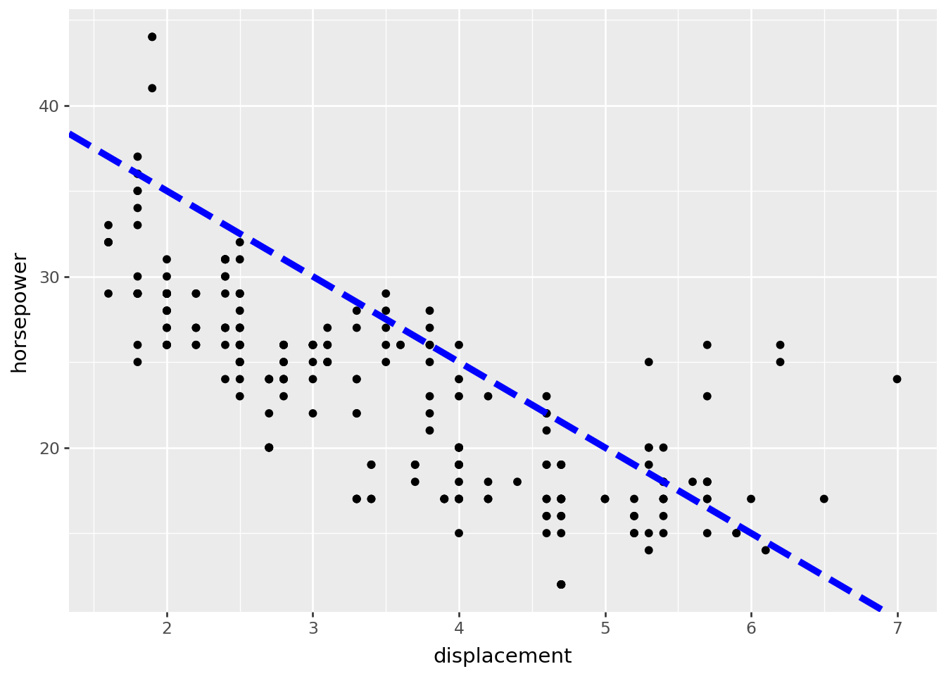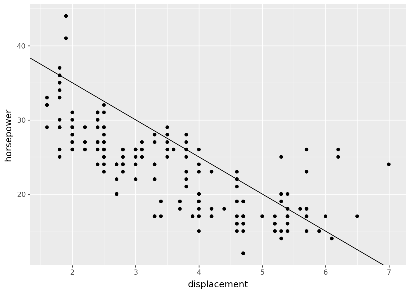 + geom_abline(intercept=45, slope=-5) # add a line ...