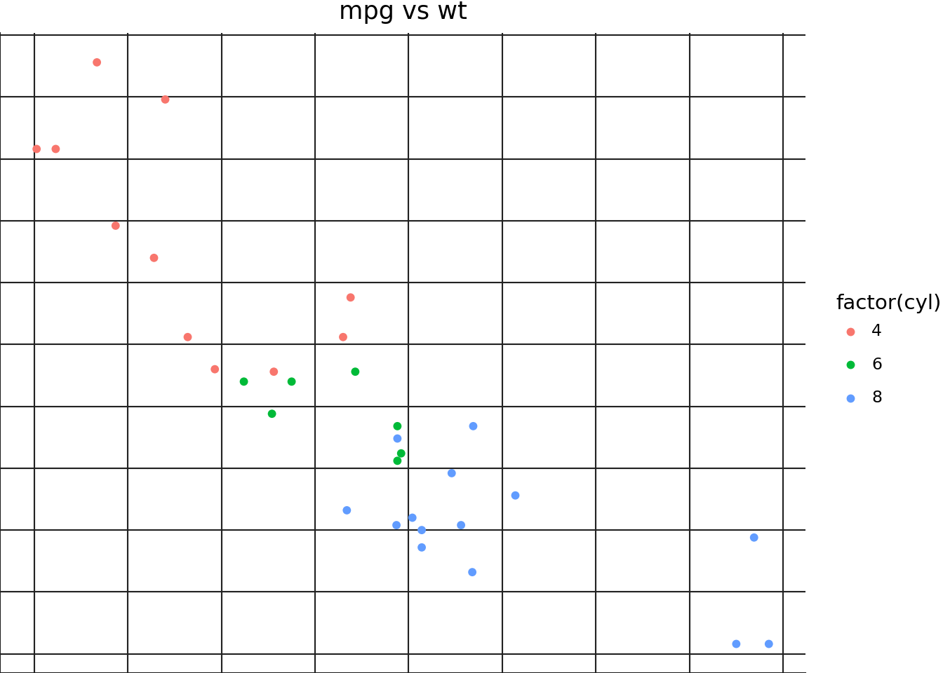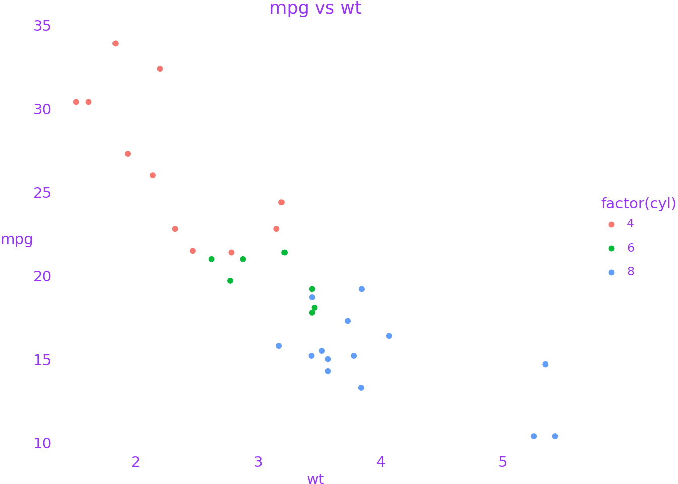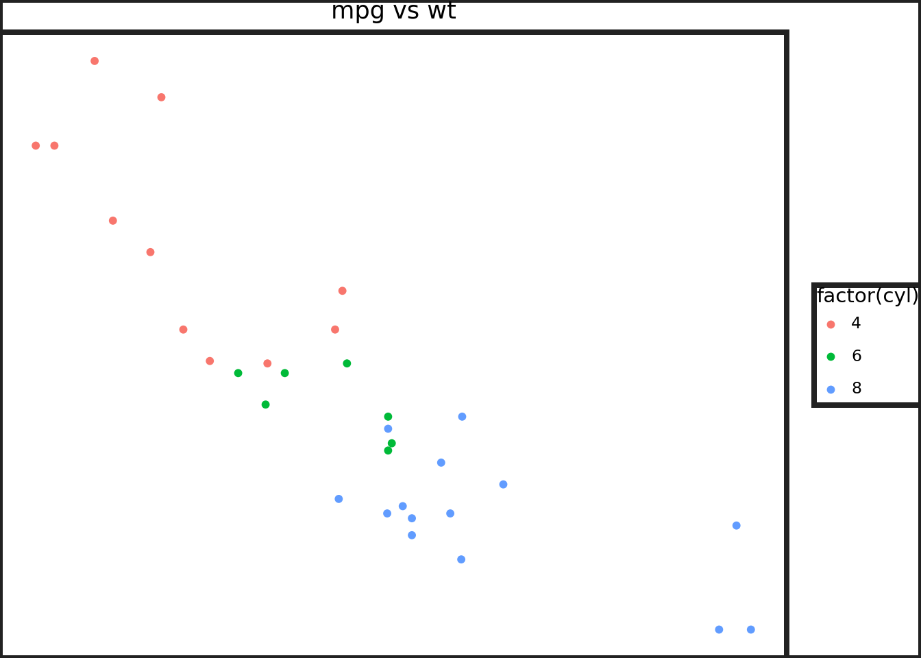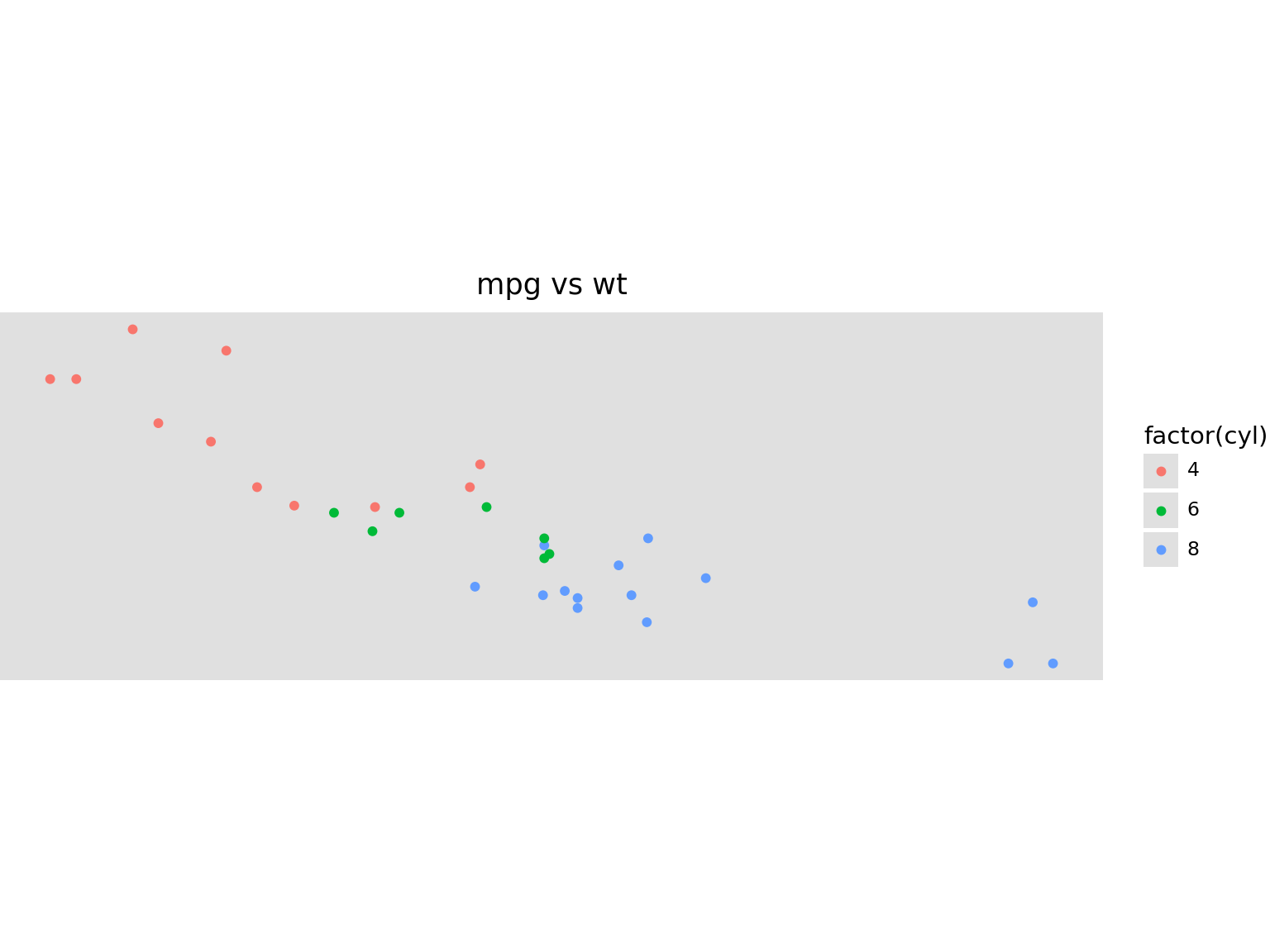 ggplot(mtcars, aes("wt", "mpg", color="factor(cyl)"))
