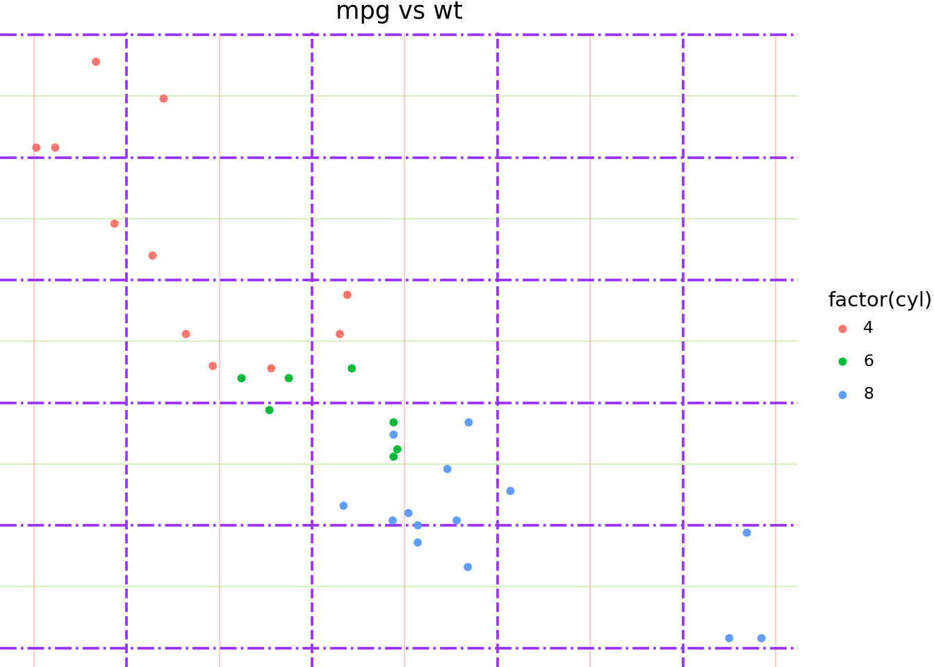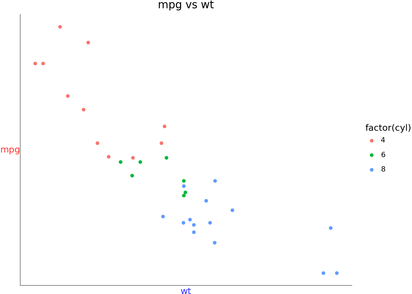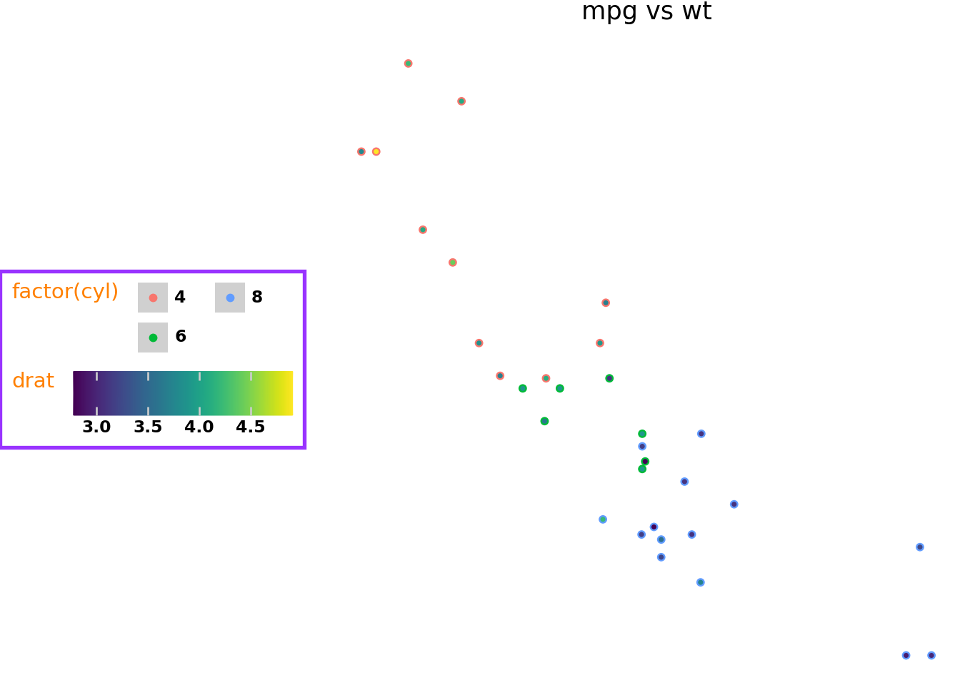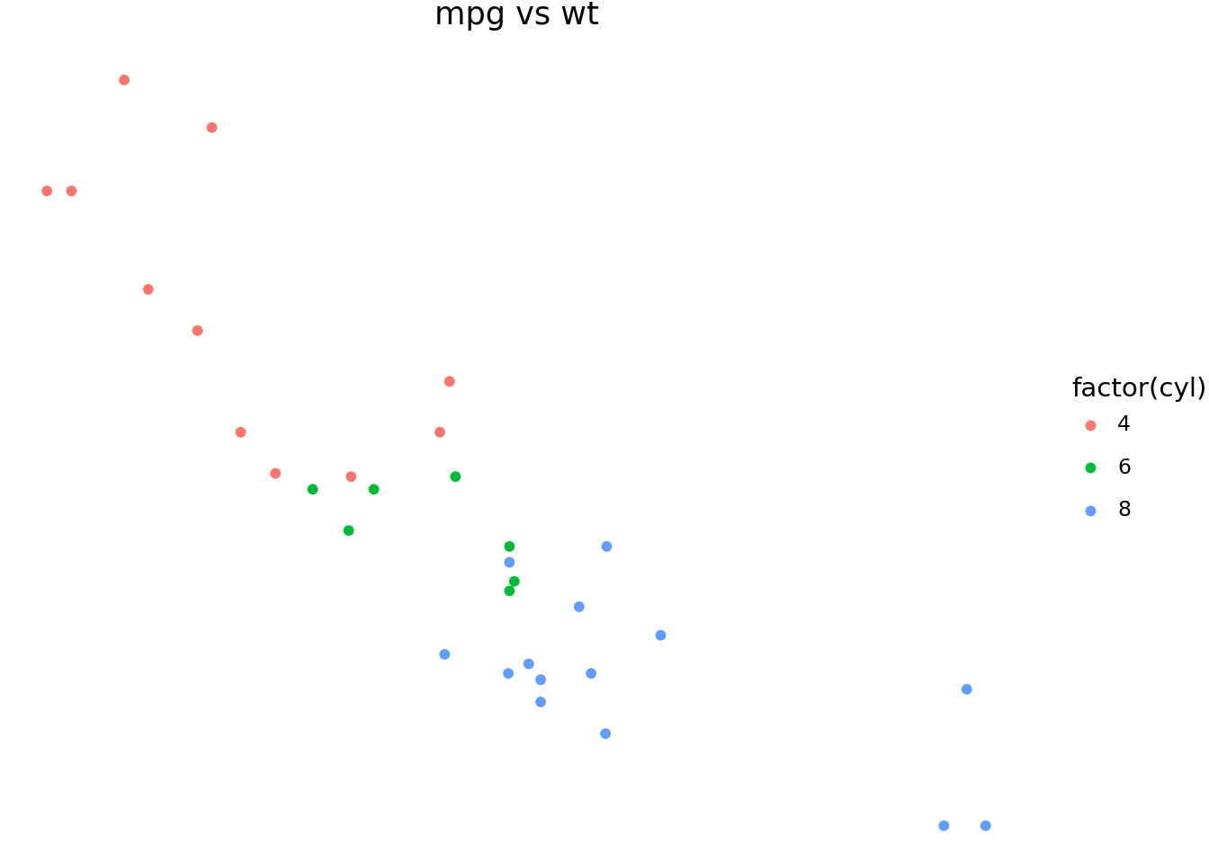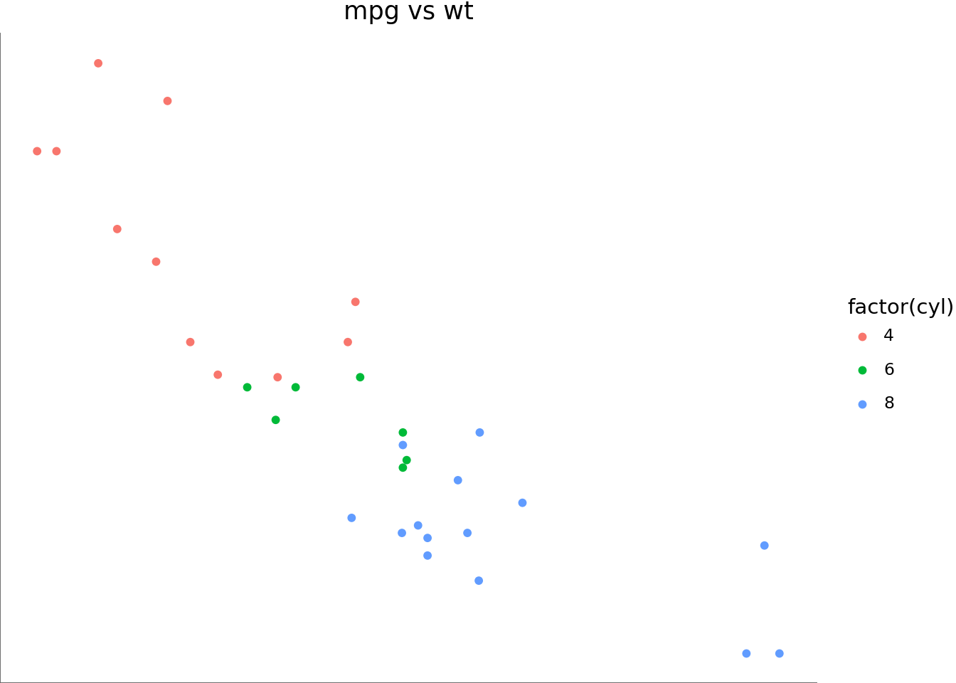 ggplot(mtcars, aes("wt", "mpg", color="factor(cyl)"))