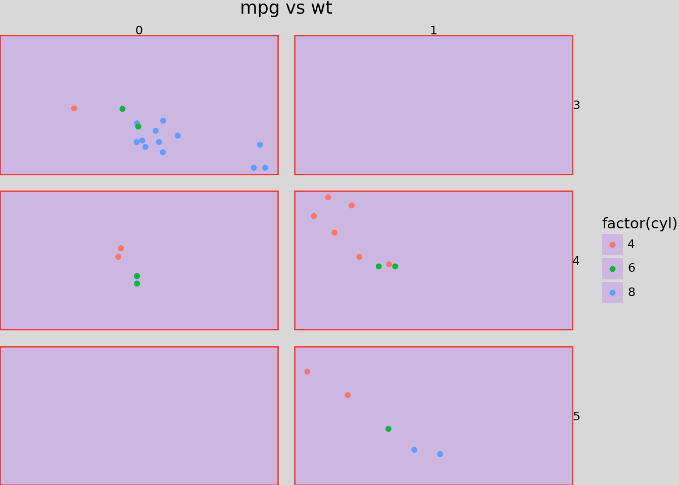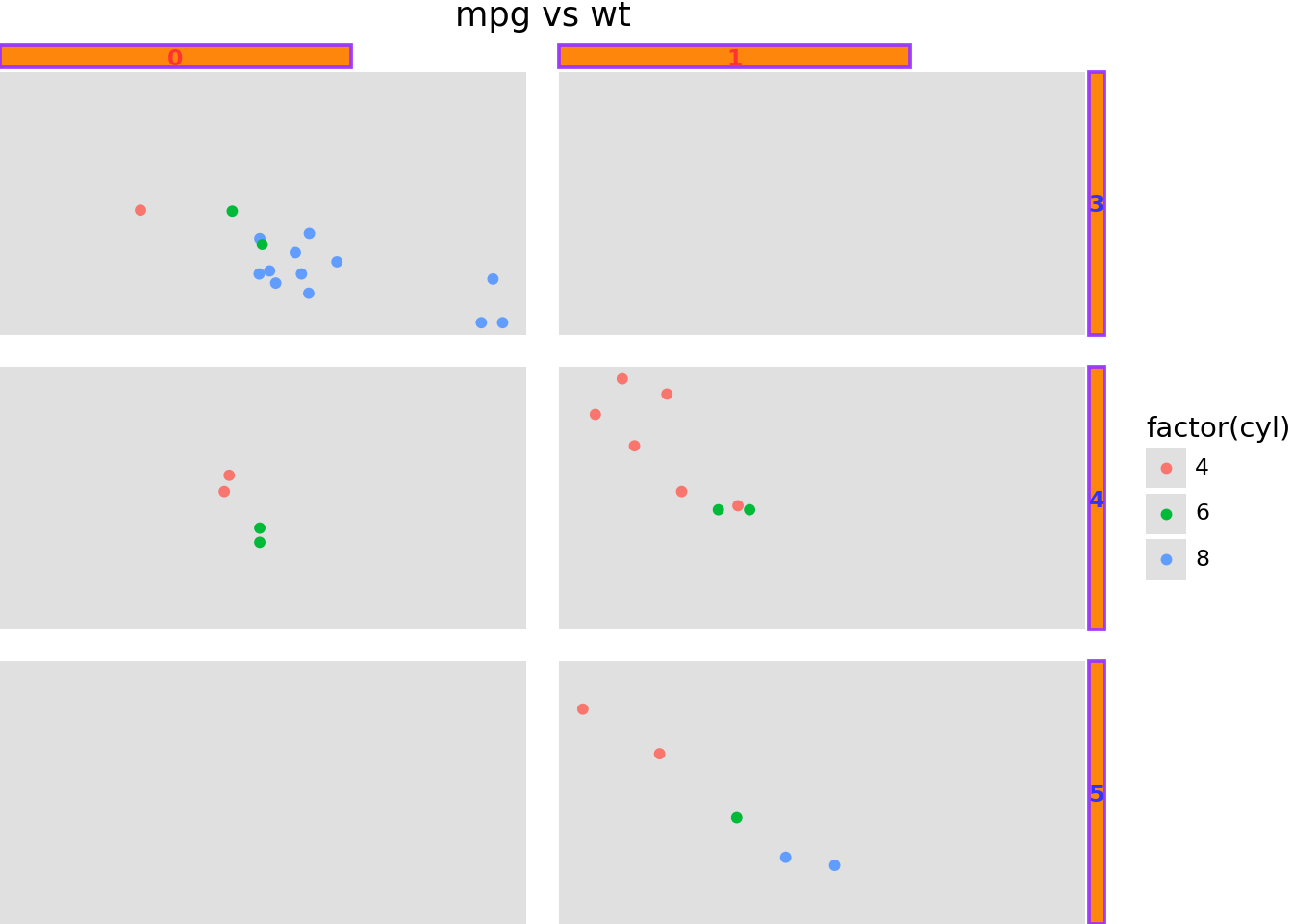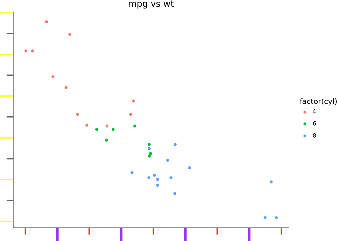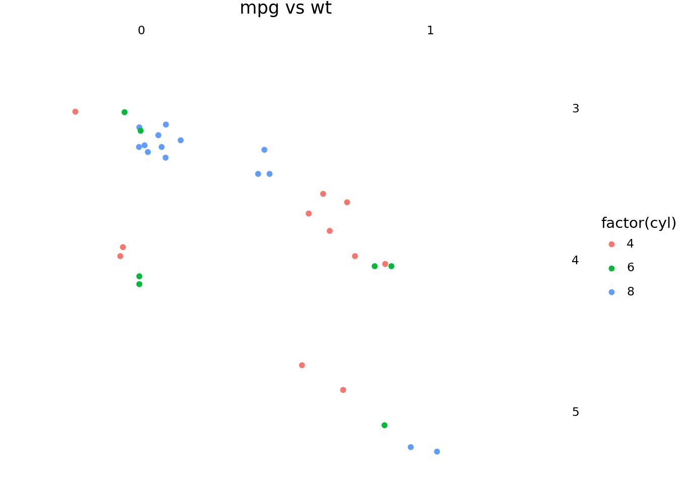 ggplot(mtcars, aes("wt", "mpg", color="factor(cyl)"))