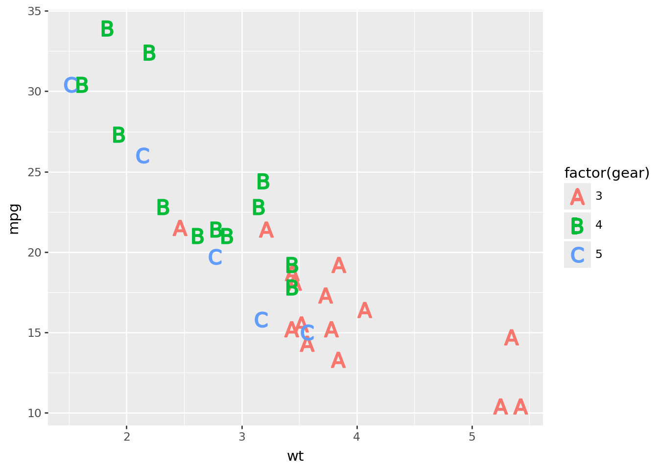 from plotnine.data import mtcarsUsing Letters as Shapes