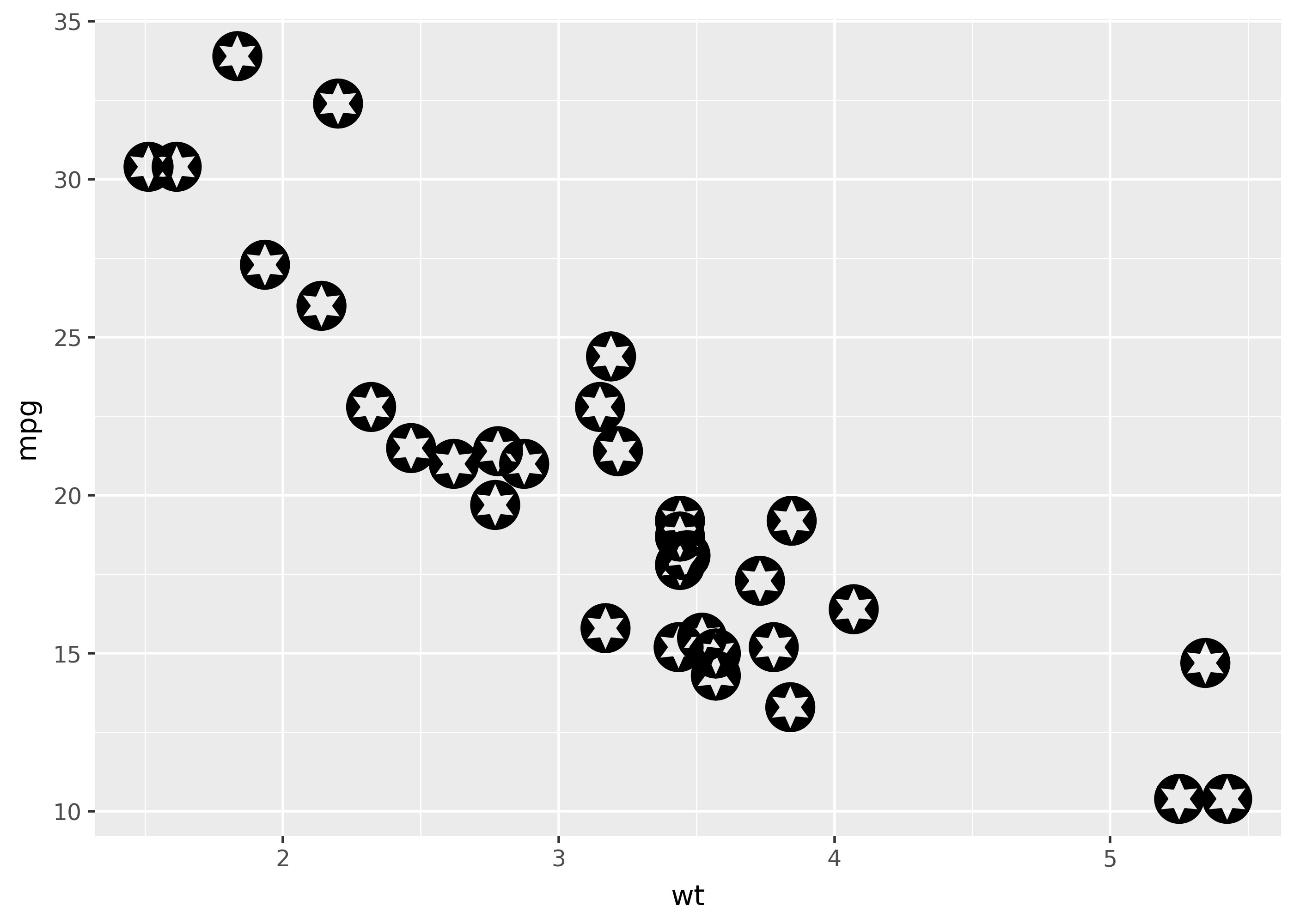 from plotnine.data import mtcars from matplotlib.path import Path star = Path.unit_regular_star(6) circle = Path.unit_circle() cut_star = Path( vertices=[*circle.vertices, *star.vertices[::-1]], codes=[*circle.codes, *star.codes] ) ( ggplot(mtcars, aes("wt", "mpg")) + geom_point(shape=cut_star, size=10) )