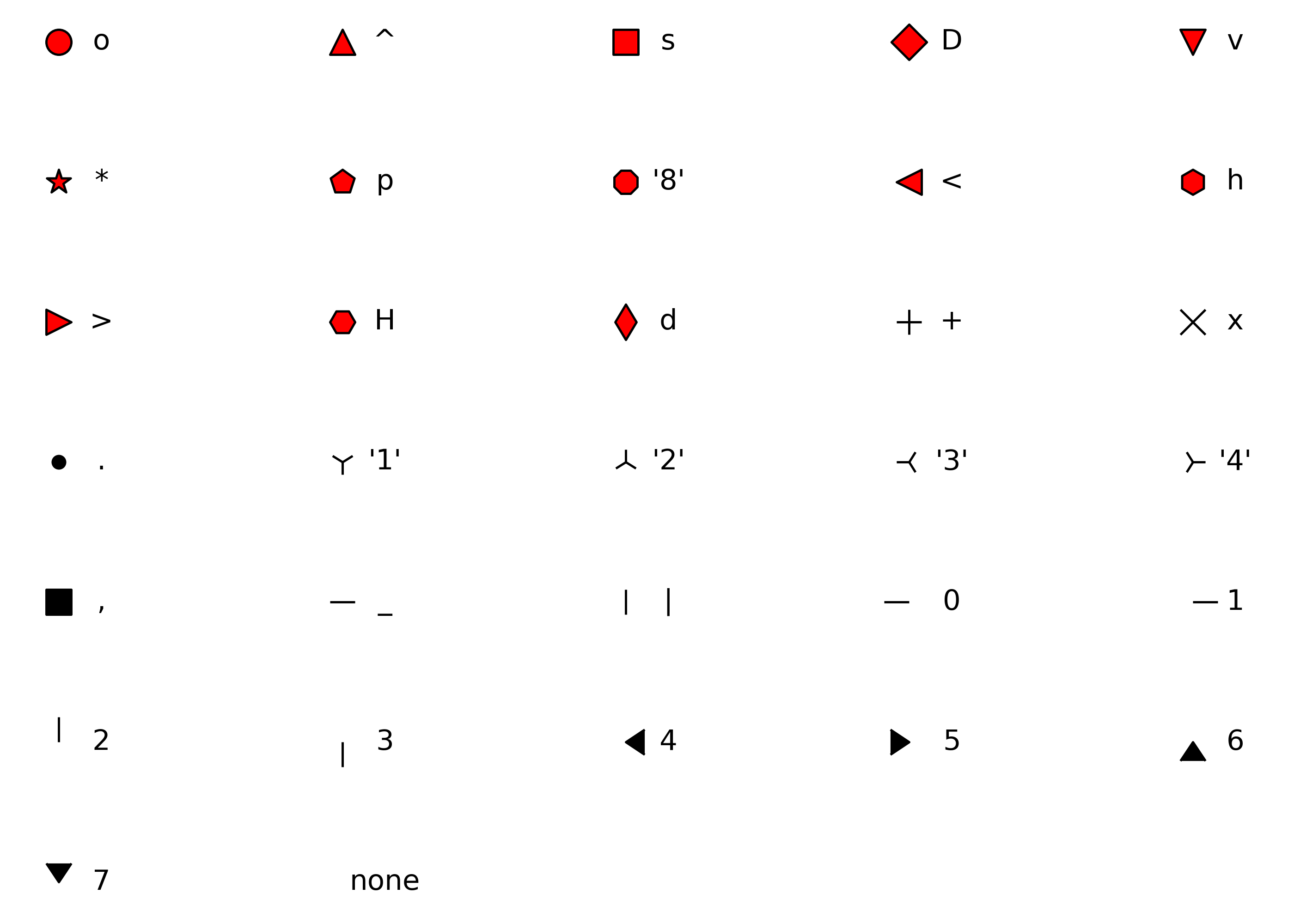 from plotnine.scales.scale_shape import shapes, unfilled_shapes shape_points = [*shapes, *unfilled_shapes, "none"] n_shapes = len(shape_points) shapes = pd.DataFrame( { "shape": shape_points, "shape_text": [repr(x) if str(x).isdigit() else x for x in shape_points], "x": [x % 5 for x in range(n_shapes)], "y": [-(x // 5) for x in range(n_shapes)], } ) ( ggplot(shapes, aes("x", "y")) + geom_point(aes(shape="shape"), size=5, fill="red") + geom_text(aes(label="shape_text"), nudge_x=0.15) + scale_shape_identity(guide=None) + theme_void() + expand_limits(x=4.1) )