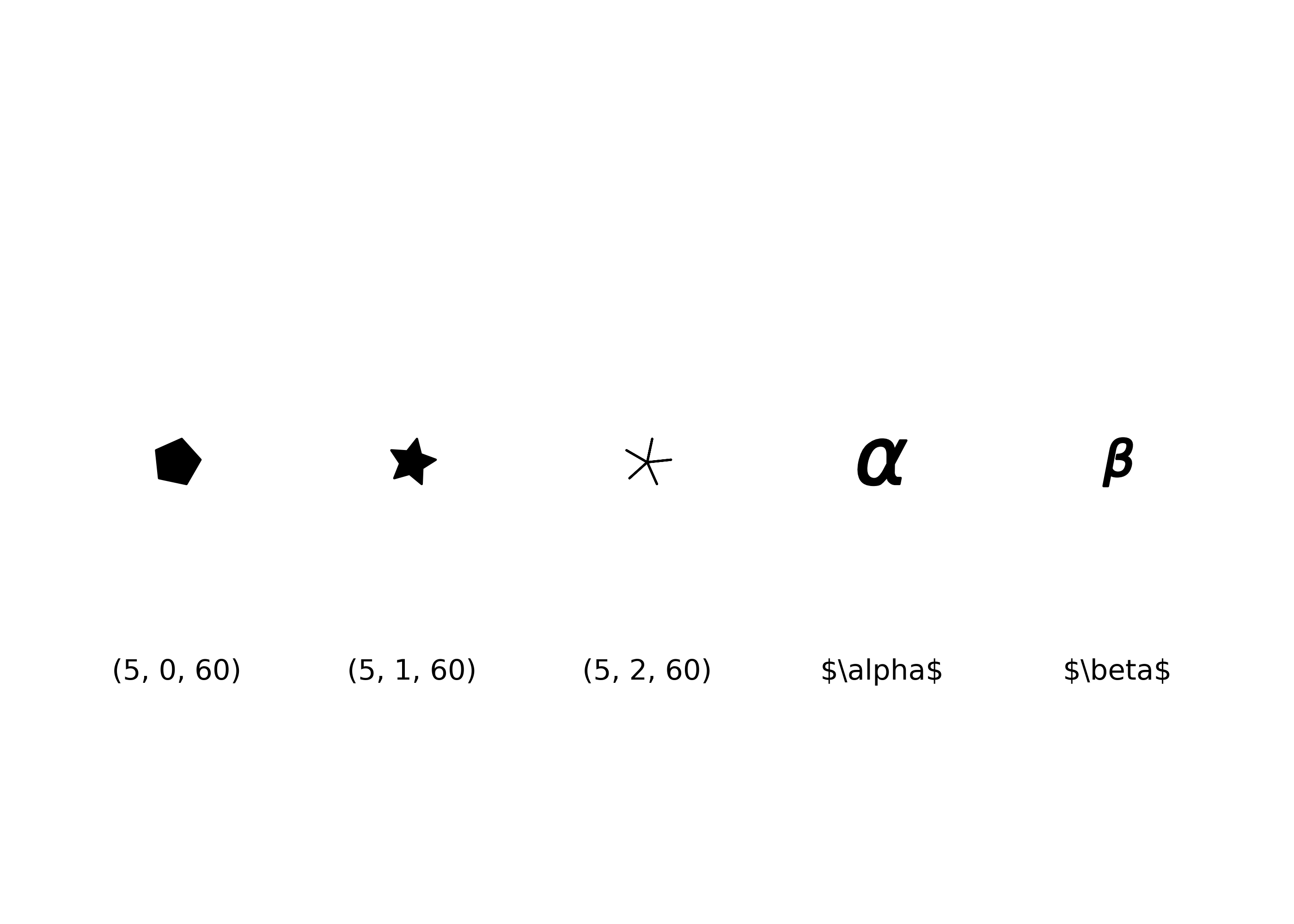 # (num, type, angle) pentagon = (5, 0, 60) # type 0: polygon five_point_star = (5, 1, 60) # type 1: star five_point_asterisk = (5, 2, 60) # type 2: asterisk shape = [pentagon, five_point_star, five_point_asterisk, "$\\alpha$", "$\\beta$"] shape_text = [x.replace("$", "\\$") if isinstance(x, str) else x for x in shape] shapes = pd.DataFrame( { "shape": shape, "shape_text": shape_text, "x": list(range(len(shape))), "y": [0] * len(shape), } ) ( ggplot(shapes, aes("x", "y")) + geom_point(aes(shape="shape"), size=10) + geom_text(aes(label="shape_text"), nudge_y=-0.1) + scale_shape_identity(guide=None) + theme_void() #+ theme(figure_size=(6, 2)) + expand_limits(y=[-0.2, 0.2], x=[-0.5, len(shape) - 0.5]) )