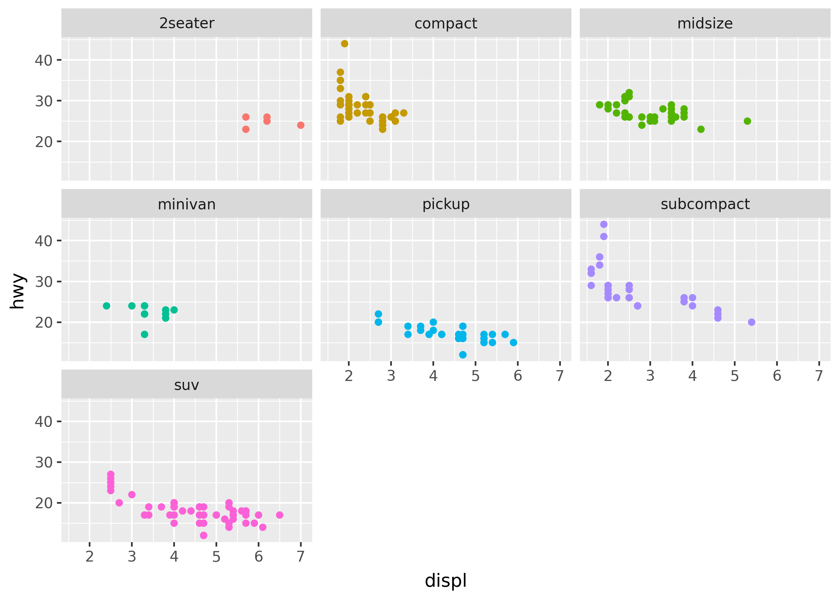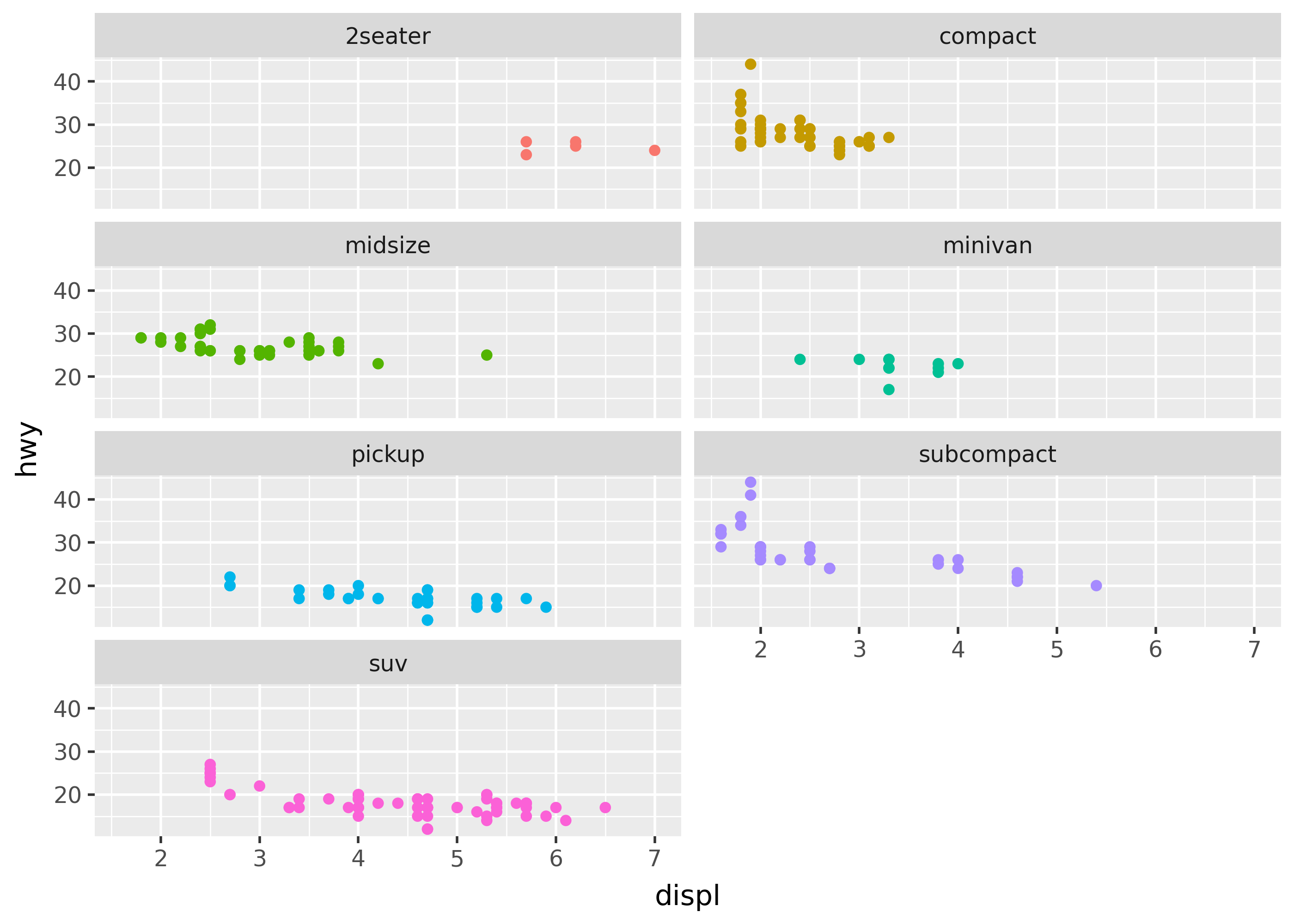 ncolornrowarguments tofacet_wrap()control the number of columns or rows. facet_grid()creates a matrix of subplots based on two or more variables.- The
