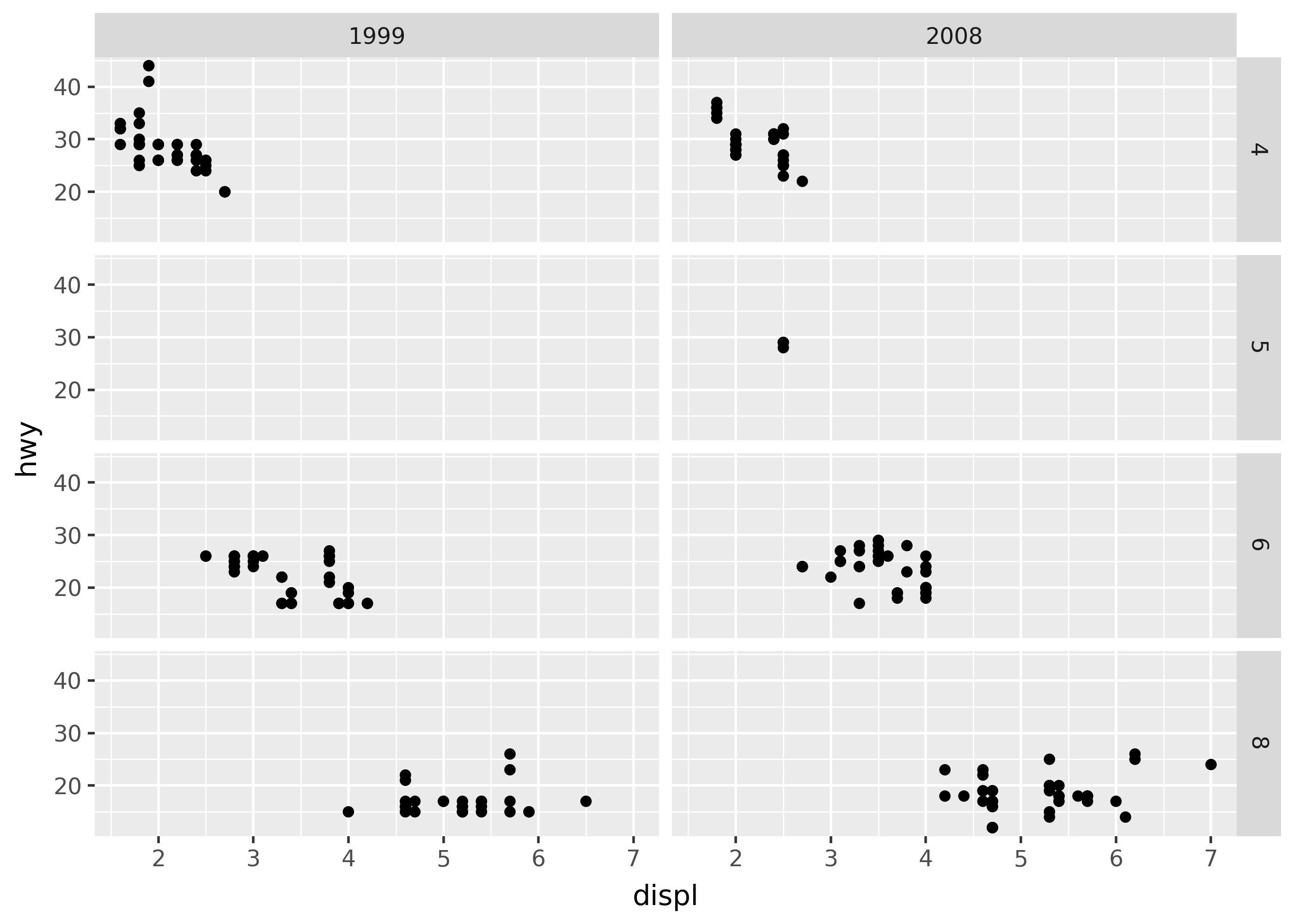 (ggplot(mpg, aes("displ", "hwy")) + geom_point() + facet_grid("cyl ~ year"))