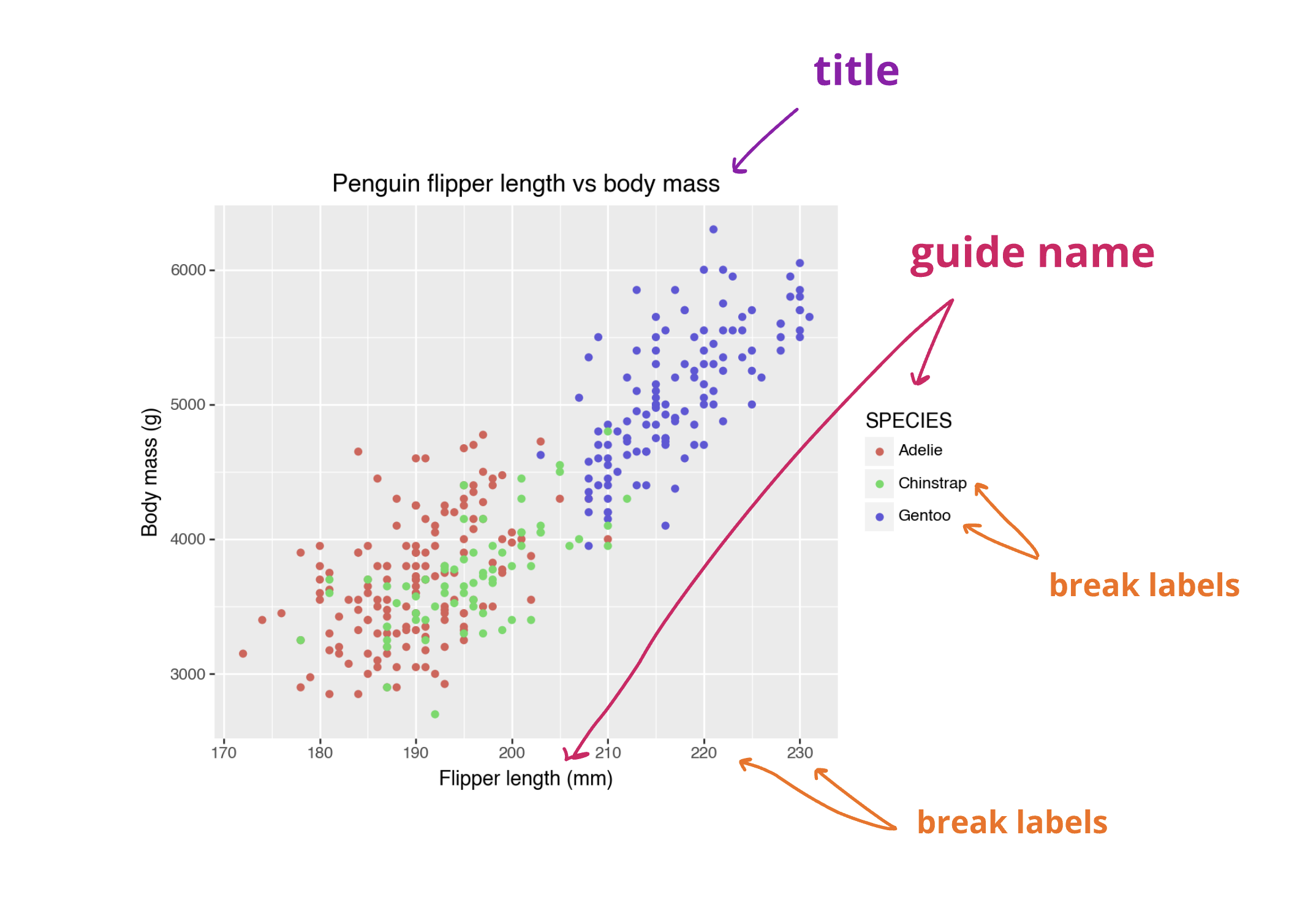 In the following sections, we’ll cover how the first two kinds of labels can quickly be set with the labs() function, and how scale breaks can be labeled using scale_*() functions.
