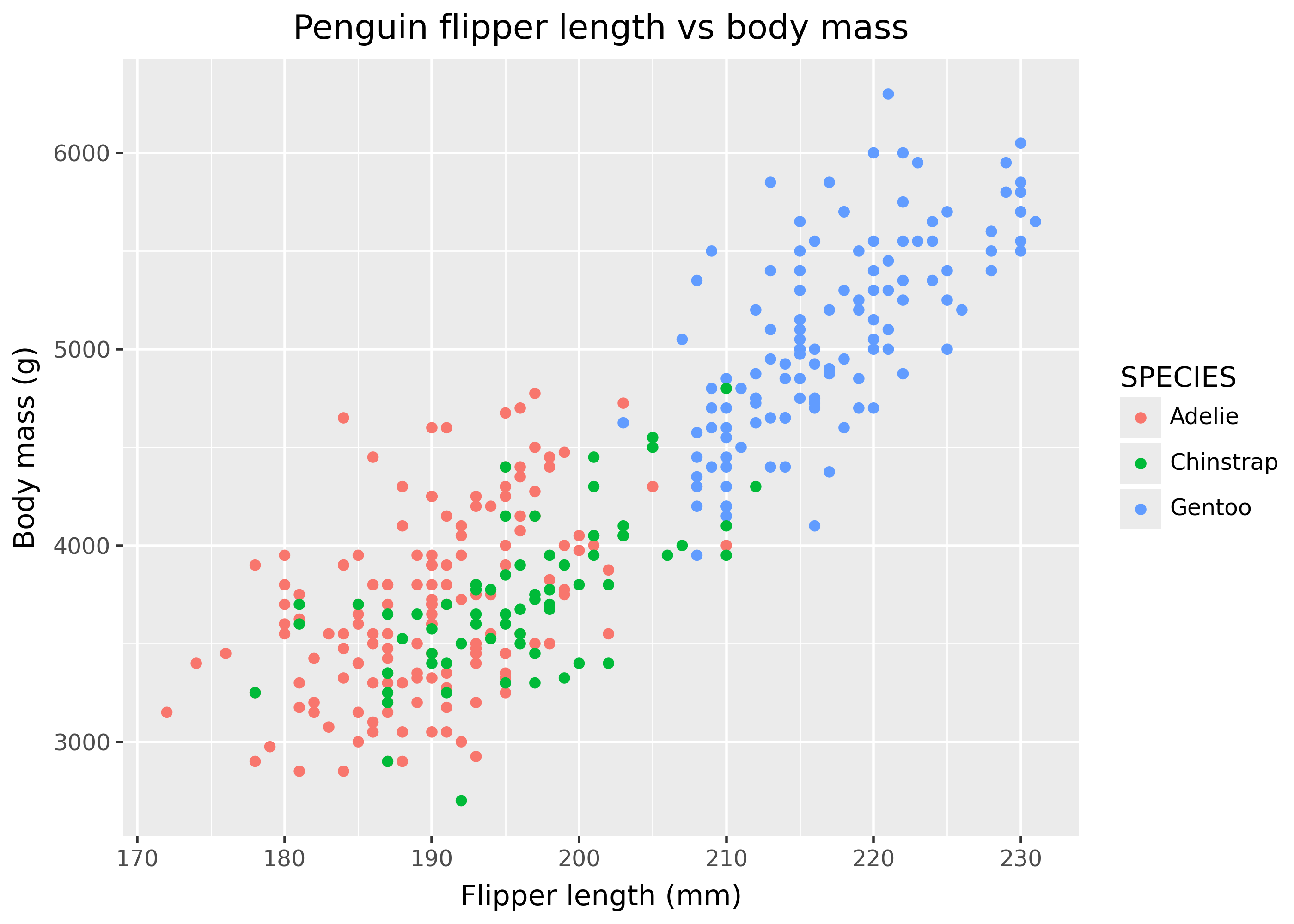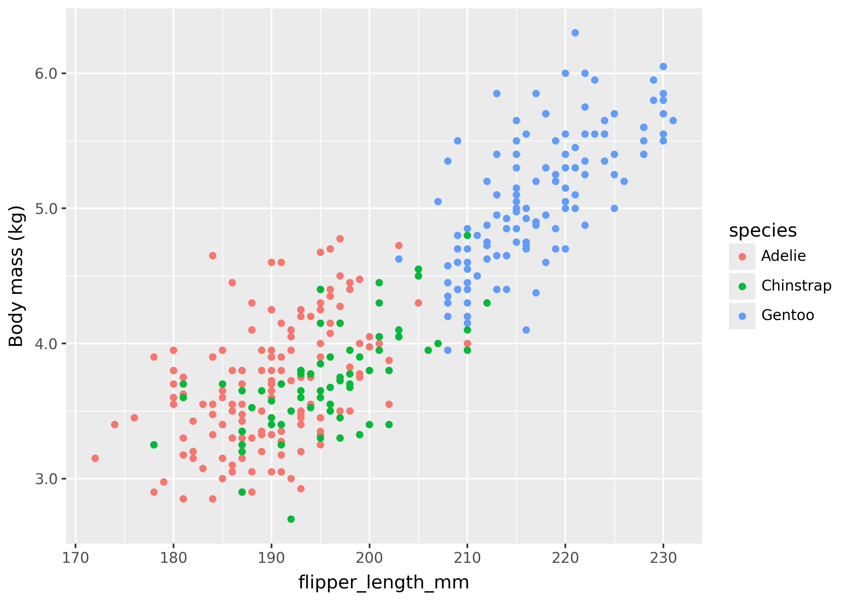 ggplot(penguins, aes("flipper_length_mm", "body_mass_g", color="species"))