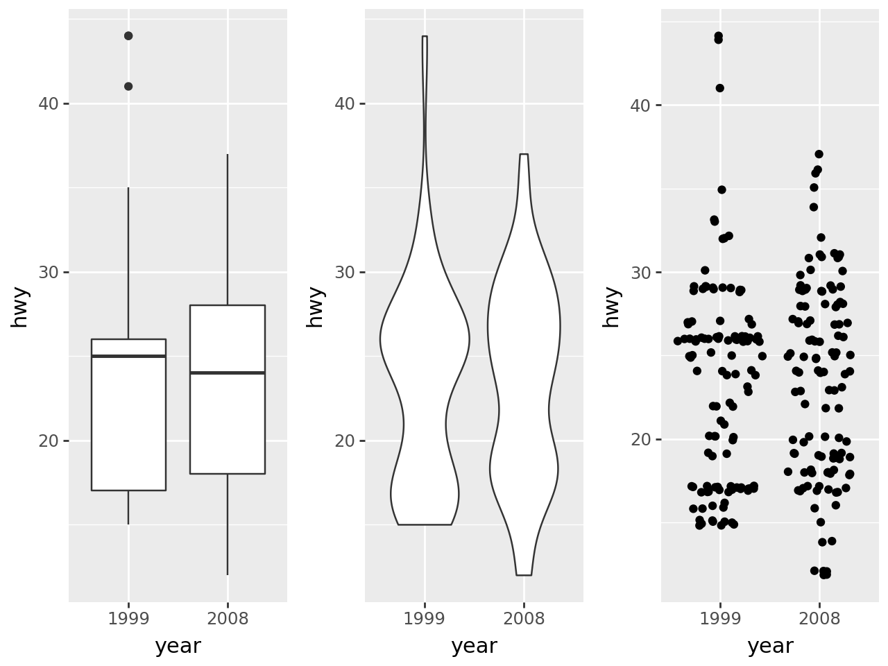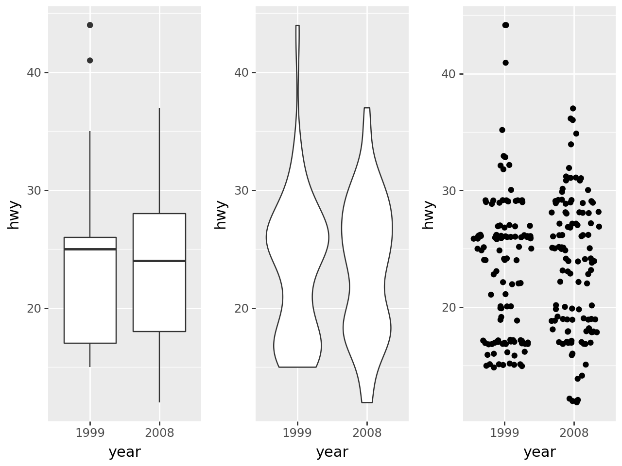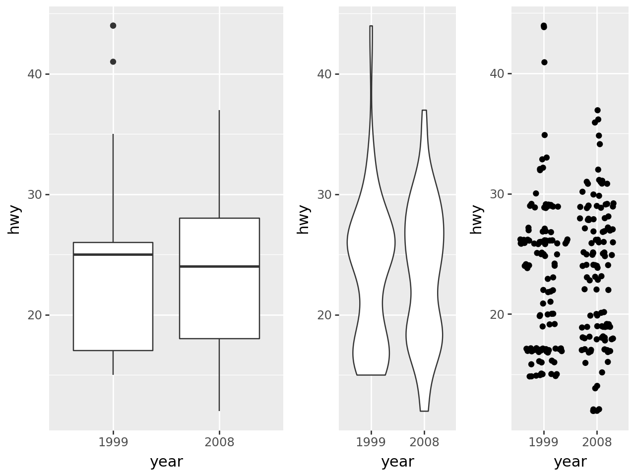 p = ggplot(mpg, aes("factor(year)", "hwy")) + labs(x="year")