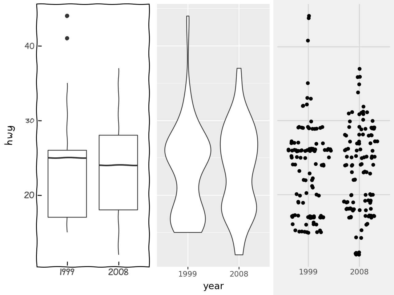 (p1 + theme_xkcd() + no_title_x) | (p2 + no_y) | (p3 + theme_538() + no_y + no_title_x)