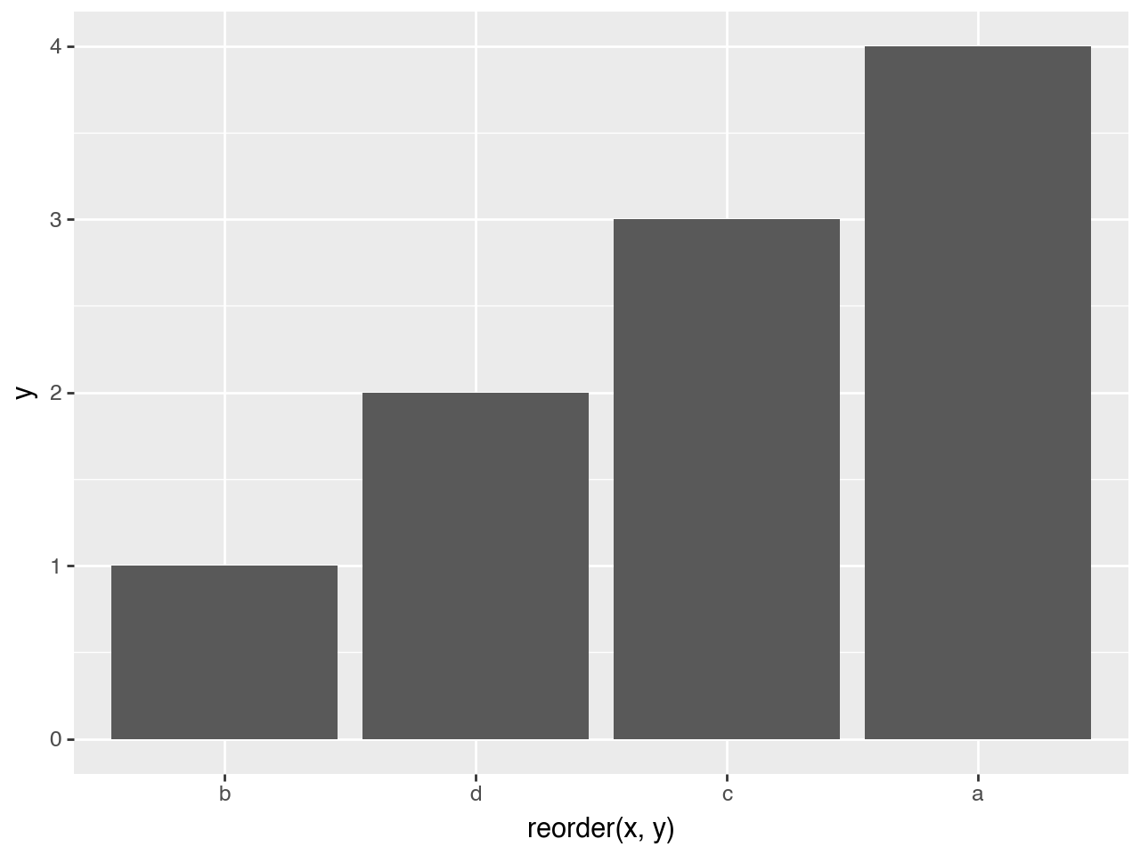 ggplot(df, aes("reorder(x, y)", "y")) + geom_col()